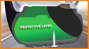 (A) Le produit LICOL est injecté à travers la valve du pneu et forme une couche de protection à l'interieur du pneu.